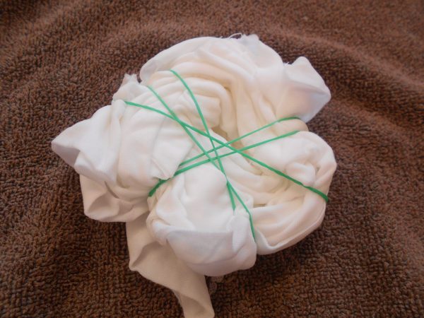 トートバックを濡らし、小さく丸めて輪ゴムで固定します。