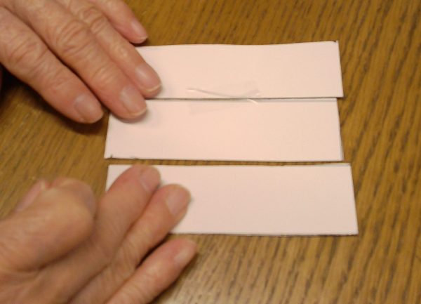 万華鏡の大きさに切ったミラー風シートを3枚並べ、テープで固定し